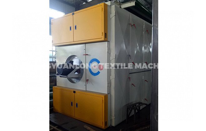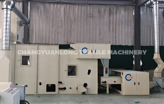2. CYLKS-开松机: 本机开松效果好,不易缠棉,产量高。把纤维、原料经喂入平帘输送至喂入罗拉,再由开松辊高速开松后,经输棉风机以适量的风量输送纤维原料供后道工作使用;并配备桥式除铁装备。