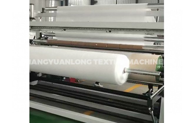 7. CYLCQ-成卷机: 该机为钢板结构,机架由整块钢板制作而成,集传动和操作系统于一体。 使用三把纵向硬切刀进行切割,一把水平飞刀由电子计米器控制。结构简单,美观大方。