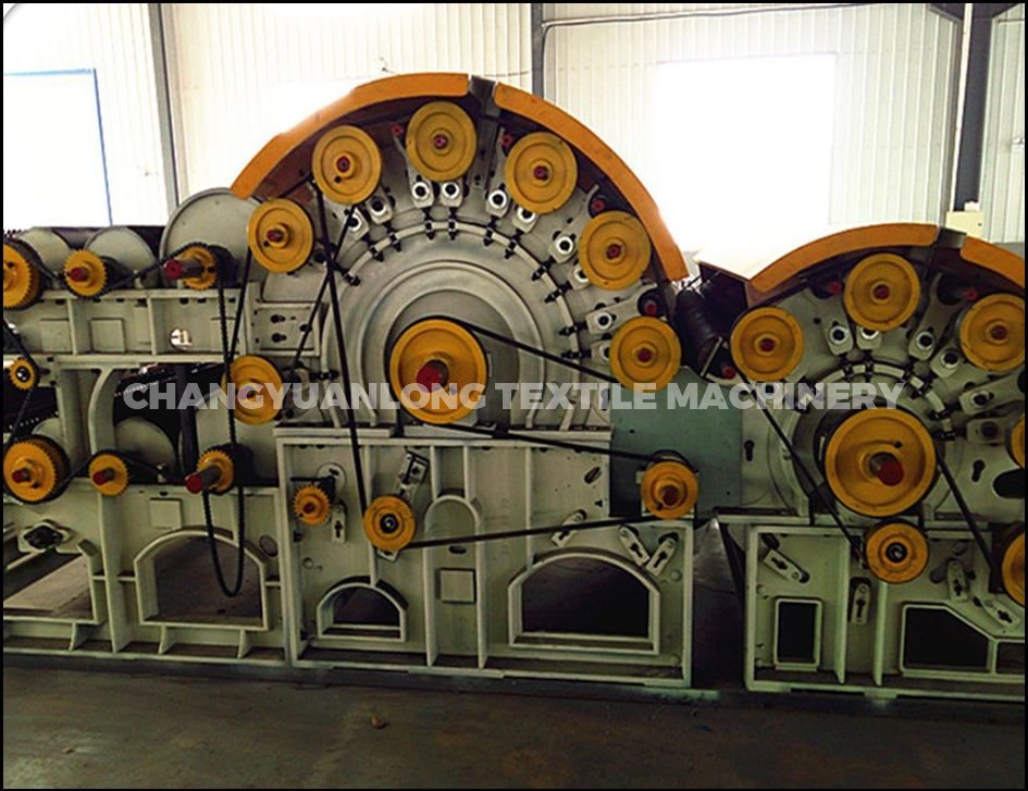 适用特点:采用四罗拉喂入,双锡林结构;胸锡林、锡林的工作辊分别单独减速机变频控制,棉网均匀,进料装有防金属保护装置,还有独有的吸边装置,飞花回收至滤网袋,保持环境卫生。