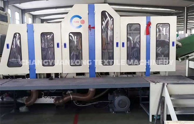 4. CYLSL-梳理机:该机为单锡林、双道夫、四杂乱、罗拉剥取。该机所有辊筒都经调质和定性处理后,再精密加工。墙板由铸铁加工而成。并配有吸风装置,可减少清机次数。该机具有分梳能力强,产量高等优点。
