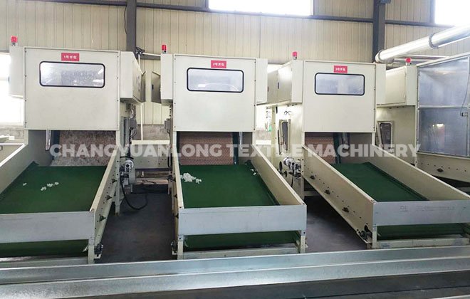 2. CYLKS-开松机: 本机开松效果好,不易缠棉,产量高。把纤维、原料经喂入平帘输送至喂入罗拉,再由开松辊高速开松后,经输棉风机以适量的风量输送纤维原料供后道工作使用;并配备桥式除铁装备。